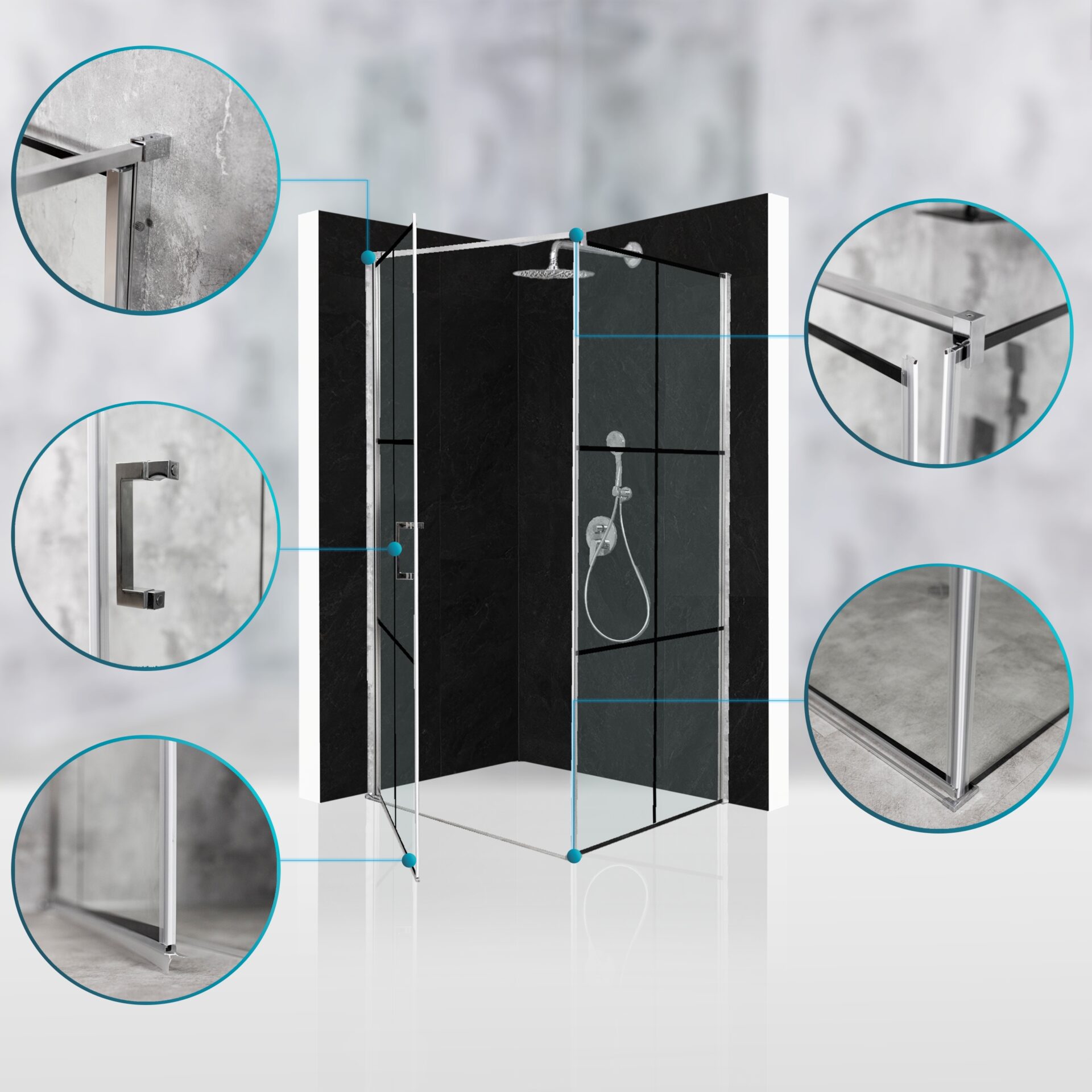 Innowacyjny system AluShield™, oparty na anodowanym i malowanym proszkowo aluminium klasy architektonicznej, zapewnia wyjątkową odporność na wilgoć, zarysowania i korozję. Subtelne wykończenie oraz niewidoczne mocowania nadają kabinie nowoczesny, elegancki i spójny wygląd.