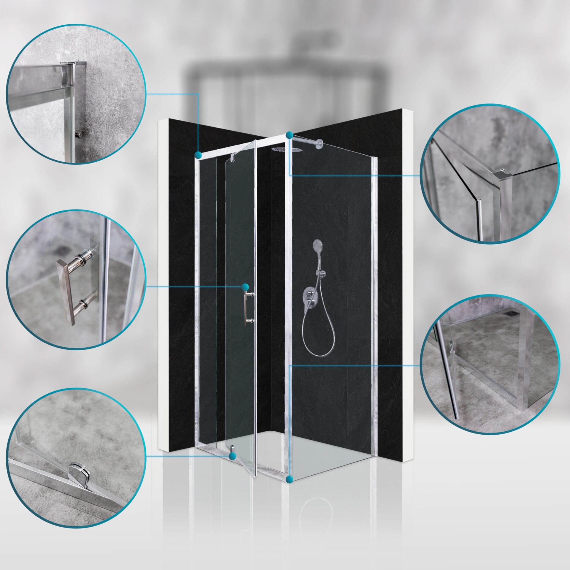 Innowacyjny system AluShield™, oparty na anodowanym i malowanym proszkowo aluminium klasy architektonicznej, zapewnia wyjątkową odporność na wilgoć, zarysowania i korozję. Subtelne wykończenie oraz niewidoczne mocowania nadają kabinie nowoczesny, elegancki i spójny wygląd.
