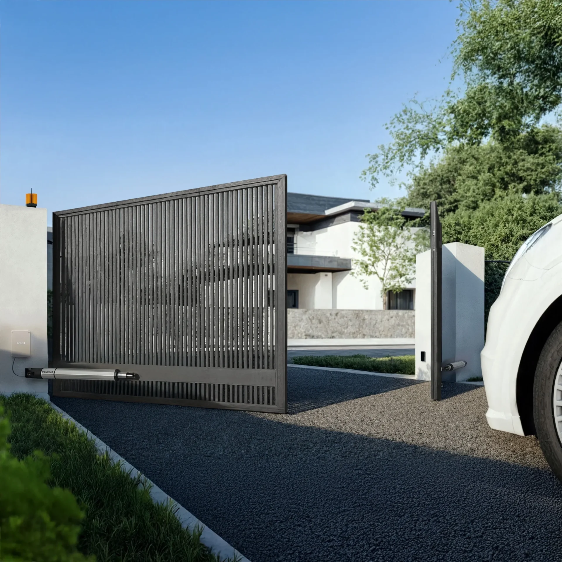 Automatyczne otwieranie bramy pozwala wjechać na posesję bez wysiadania z samochodu. System działa sprawnie w każdych warunkach pogodowych — od mrozu po upały.