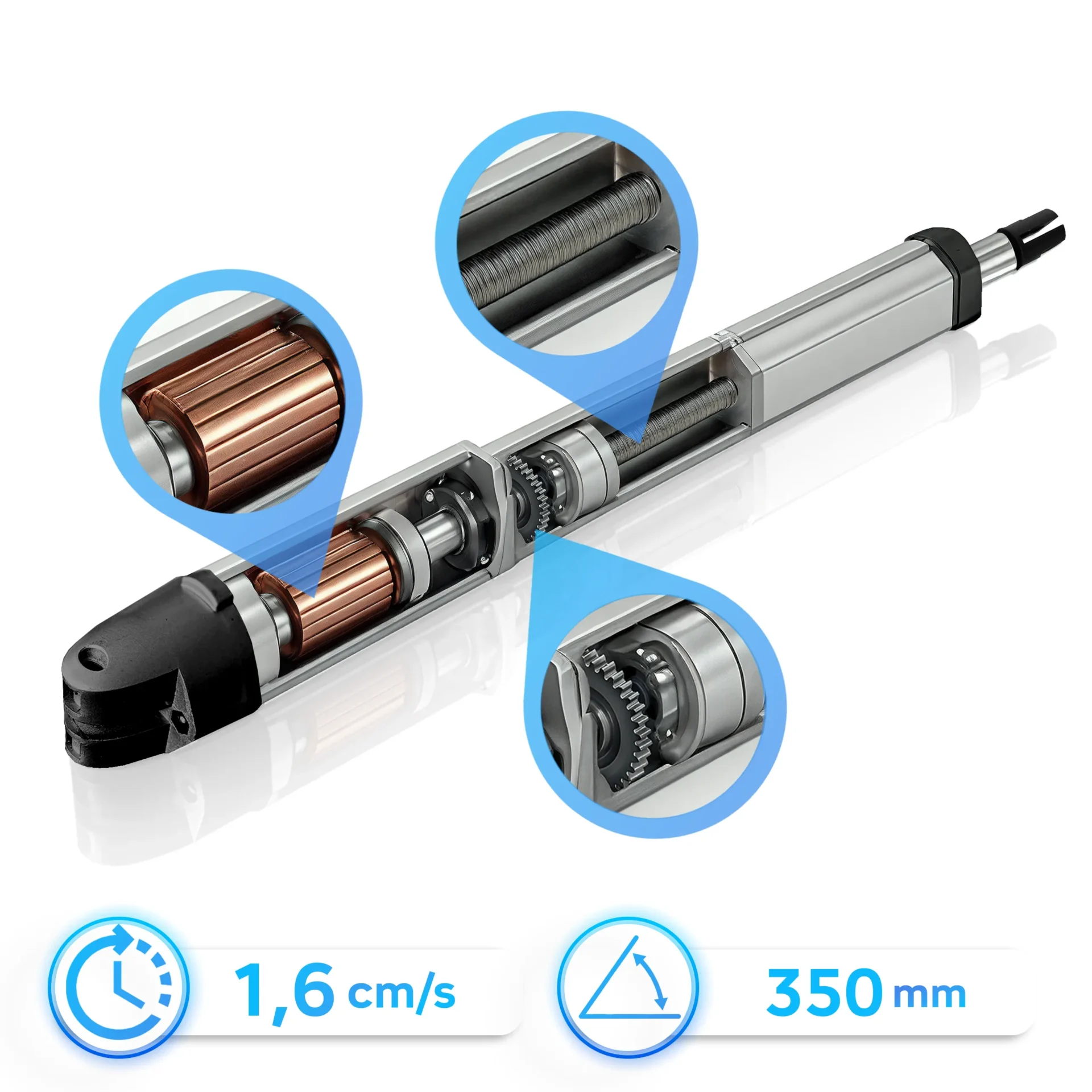 Silnik 24V DC w technologii TORQ-DRIVE zapewnia odpowiedni moment obrotowy i energooszczędną pracę. Przekładnia SOFT-GEAR wykonana z mosiądzu i hartowanej stali gwarantuje trwałość oraz płynne działanie bez drgań.