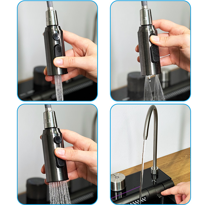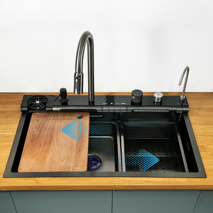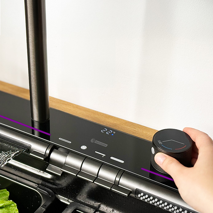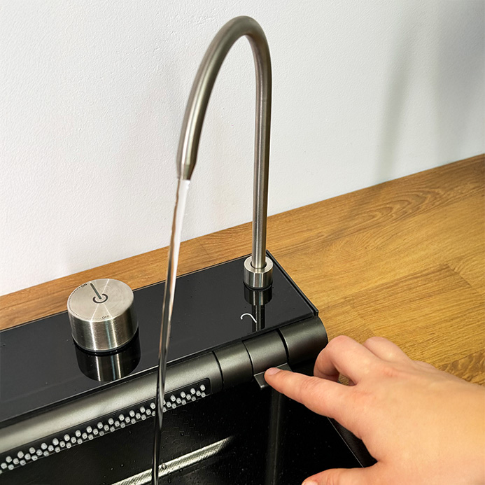 Podświetlany panel LED z wyświetlaczem LCD nie tylko nadaje zlewozmywakowi nowoczesny charakter, ale też umożliwia pełną kontrolę wszystkich funkcji – od kranu po wodospady i myjkę do szklanek.