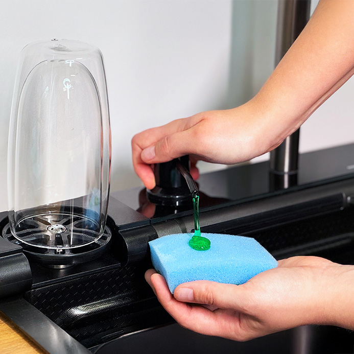 Wbudowany dozownik na płyn do naczyń oszczędza miejsce na blacie i pozwala zachować czystość w kuchni.