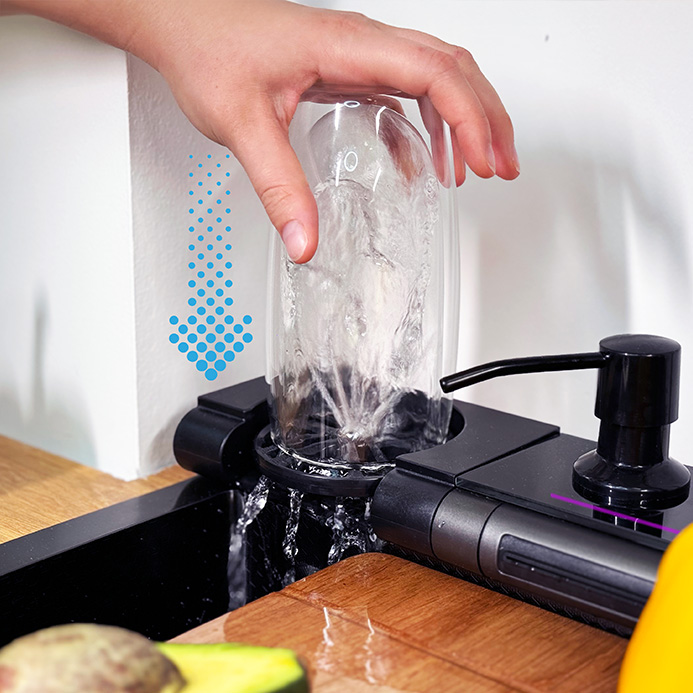Specjalna głowica wysokociśnieniowa umożliwia dokładne mycie szklanek, kubków i butelek w kilka sekund, zużywając przy tym mniej wody niż tradycyjne mycie.