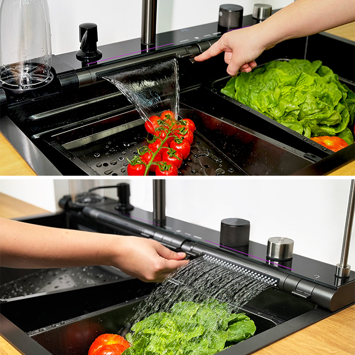 Dwa krany typu wodospad umożliwiają delikatne płukanie warzyw i owoców, minimalizując rozpryski oraz nadając zlewowi wyjątkowego charakteru.