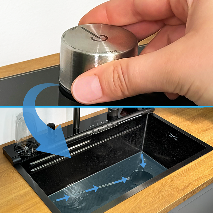 Praktyczny przełącznik pozwala spuścić wodę bez zanurzania rąk, co zwiększa komfort korzystania ze zlewu. Nachylone dno ułatwia odpływ, a rura spustowa po prawej stronie oszczędza miejsce w szafce.