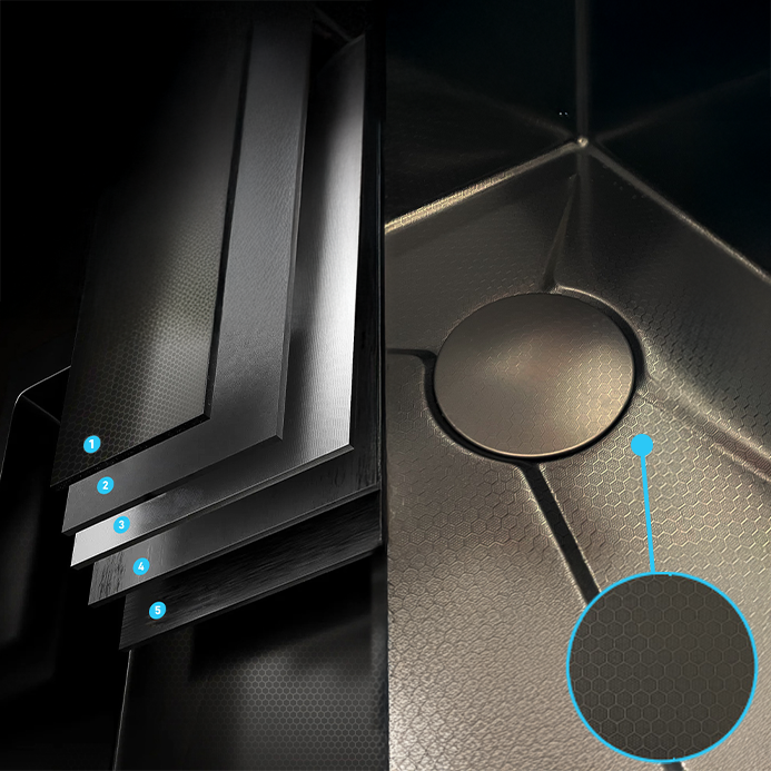 Stalowy zlewozmywak z 5-warstwową powierzchnią (stal nierdzewna, antykorozyjna, wzmacniająca, olejoodporna i hydrofobowa) zapewnia wyjątkową trwałość i higienę. Dzięki nanotechnologii i powłoce PVD jest odporny na zarysowania, temperaturę, chemię i zachowuje elegancki wygląd przez lata.