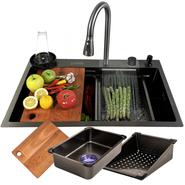 Stylowy kran wodospadowy pozwala na delikatne płukanie warzyw i owoców, minimalizując rozpryski wody. To praktyczne i nowoczesne rozwiązanie, które nadaje kuchni elegancki charakter.