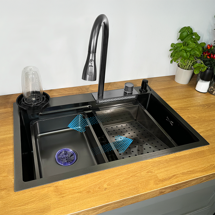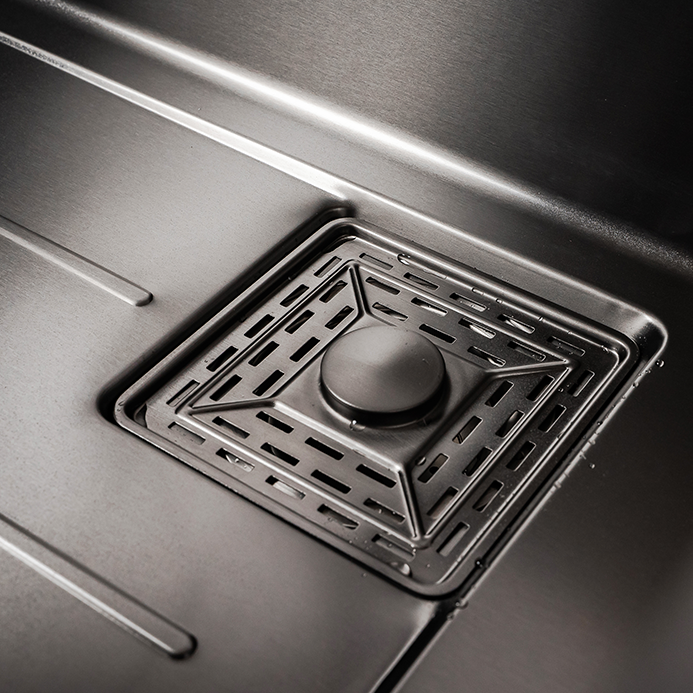 Stal nierdzewna SUS304 z nanoskorpową powłoką PVD zapewnia odporność na zarysowania, temperaturę i chemię. Dno zlewu z delikatnym spadkiem i rowkami ułatwia odpływ wody oraz utrzymanie czystości.