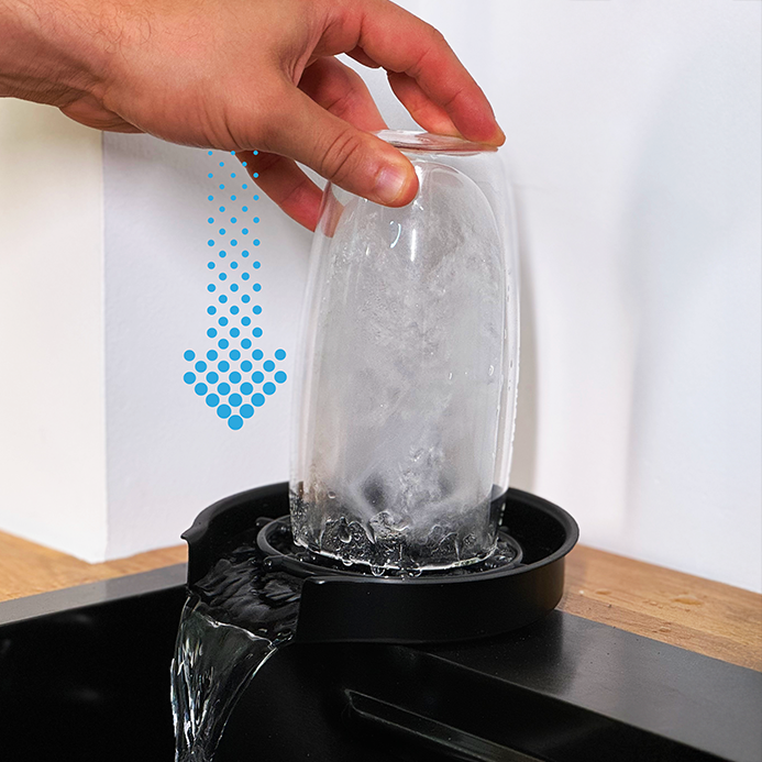 Specjalna głowica wysokociśnieniowa umożliwia dokładne mycie szklanek, kubków i butelek w kilka sekund, zużywając przy tym mniej wody niż tradycyjne mycie.