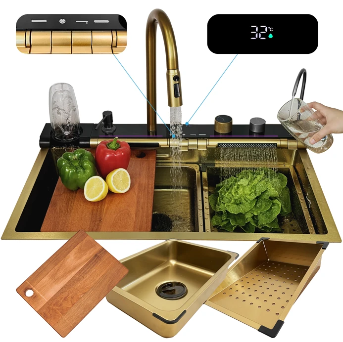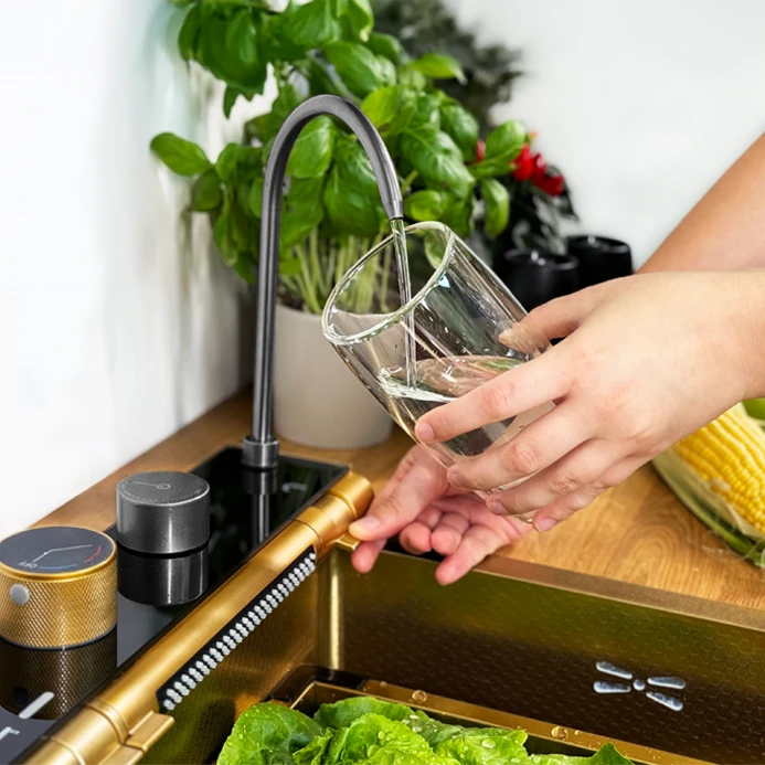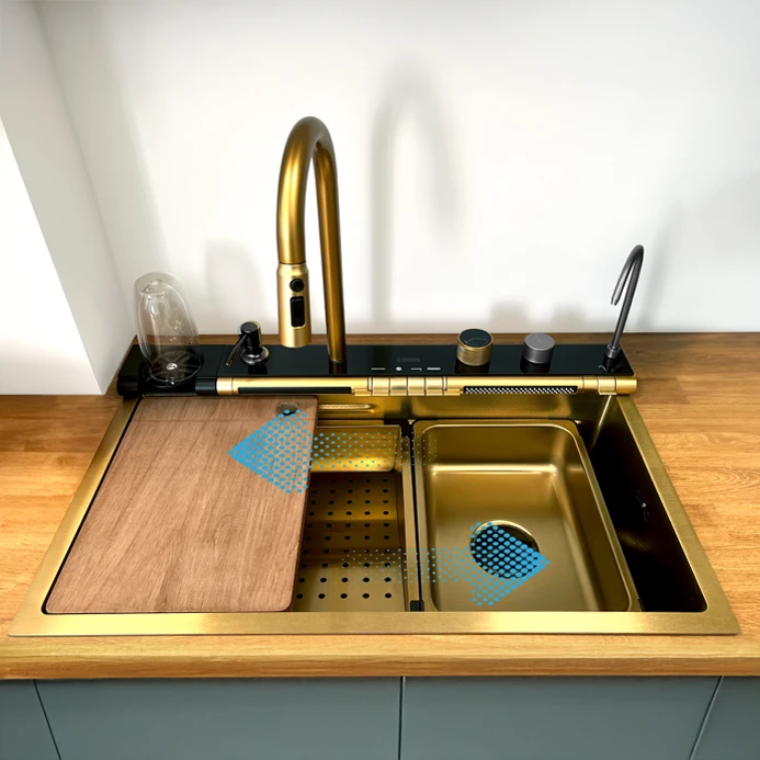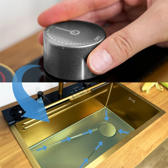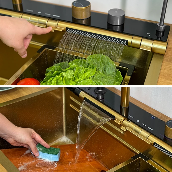 Dwa krany typu wodospad umożliwiają delikatne płukanie warzyw i owoców, minimalizując rozpryski oraz nadając zlewowi wyjątkowego charakteru.