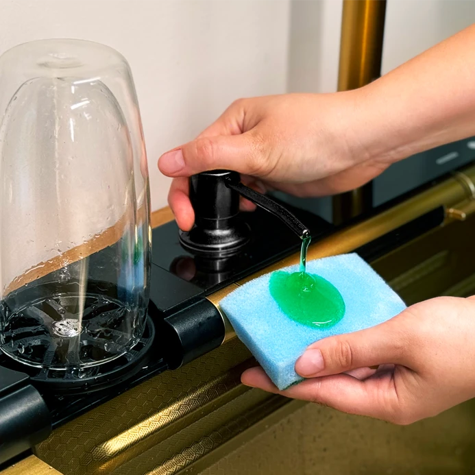 Wbudowany dozownik na płyn do naczyń oszczędza miejsce na blacie i pozwala zachować czystość w kuchni.