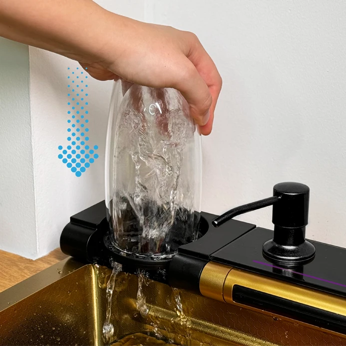 Specjalna głowica wysokociśnieniowa umożliwia dokładne mycie szklanek, kubków i butelek w kilka sekund, zużywając przy tym mniej wody niż tradycyjne mycie.