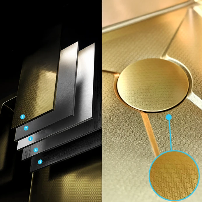 Stalowy zlewozmywak z 5-warstwową powierzchnią (stal nierdzewna, antykorozyjna, wzmacniająca, olejoodporna i hydrofobowa) zapewnia wyjątkową trwałość i higienę. Dzięki nanotechnologii i powłoce PVD jest odporny na zarysowania, temperaturę, chemię i zachowuje elegancki wygląd przez lata.