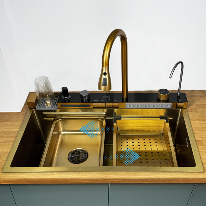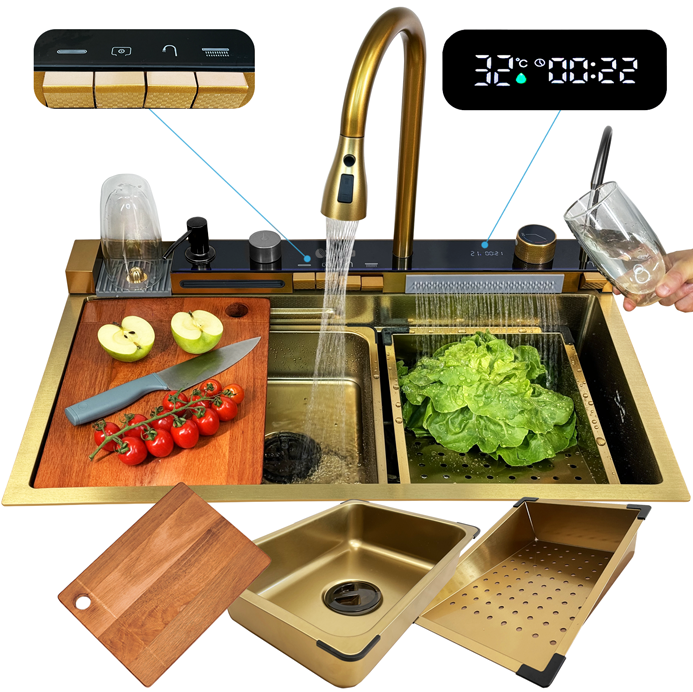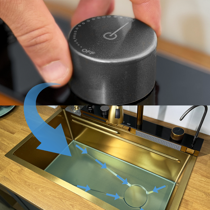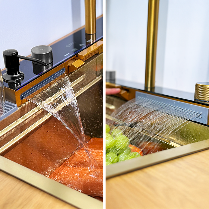 Dwa krany typu wodospad umożliwiają delikatne płukanie warzyw i owoców, minimalizując rozpryski oraz nadając zlewowi wyjątkowego charakteru.