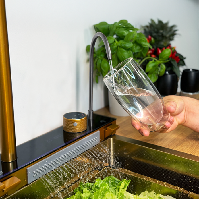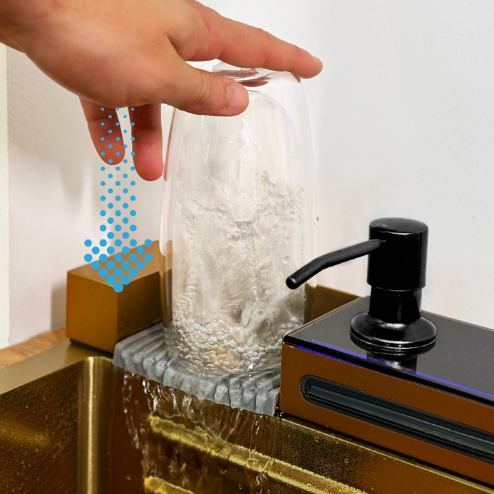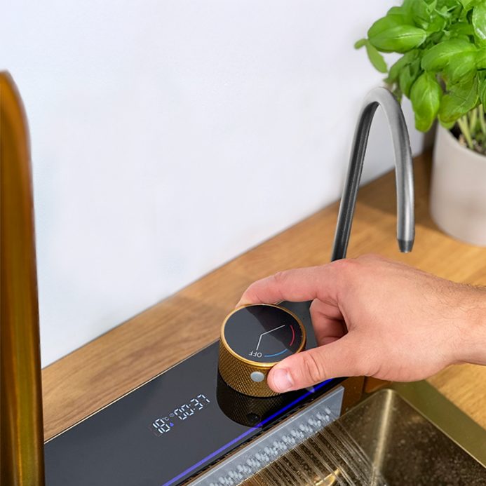 Podświetlany panel LED z wyświetlaczem LCD nie tylko nadaje zlewozmywakowi nowoczesny charakter, ale też umożliwia pełną kontrolę wszystkich funkcji – od kranu po wodospady i myjkę do szklanek.