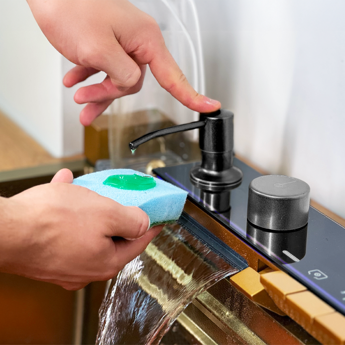 Wbudowany dozownik na płyn do naczyń oszczędza miejsce na blacie i pozwala zachować czystość w kuchni.